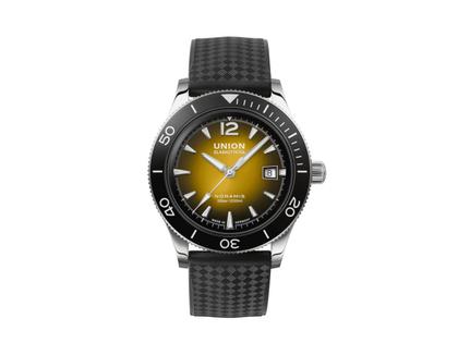Taucheruhr, Automatik, Kaliber UNG-07.S1, 60 Stunden Gangreserve, Siliziumspirale, Edelstahlgehäuse im Durchmesser von 42 mm, Höhe 12,8 mm, Zifferblatt changiert von Bernsteingelb in der Mitte zu Schwarz am äußeren Rand, Leuchtmasse Superluminova, Datumsanzeige, schwarze einseitig drehbare Keramiklünette, schwarzes Textilband mit Faltschließe, Schnellwechselfederstege für den werkzeuglosen Austausch, beidseitig entspiegeltes Saphirglas, 20 bar wasserdicht
