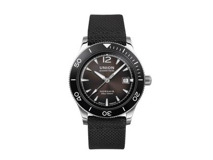 Taucheruhr, Automatik, Kaliber UNG-07.S1, 60 Stunden Gangreserve, Siliziumspirale, Edelstahlgehäuse im Durchmesser von 42 mm, Höhe 12,8 mm, schwarz-braunes Zifferblatt mit Indizes, Leuchtmasse Superluminova, Datumsanzeige, schwarze einseitig drehbare Keramiklünette, schwarzes Textilband mit Dornschließe, Schnellwechselfederstege für den werkzeuglosen Austausch, beidseitig entspiegeltes Saphirglas, 20 bar wasserdicht