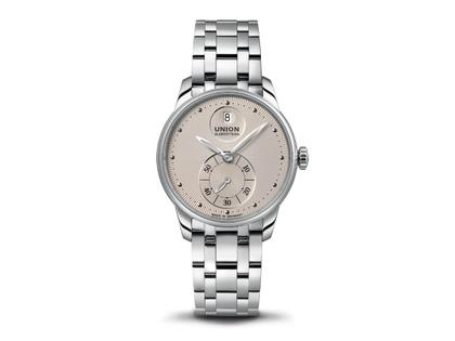 Automatik, Kaliber UNG-28.01, 60 Stunden Gangreserve, Edelstahl, Durchmesser 36 mm, Höhe 9,9 mm, beiges guillochiertes Zifferblatt mit Indizes, Edelstahlband mit Faltschließe, Saphirglas, 5 bar wasserdicht