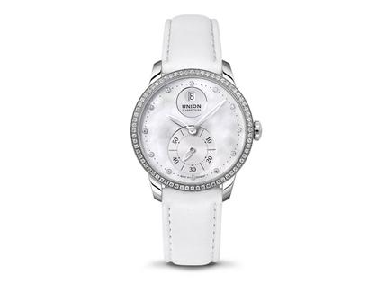 Automatik, Kaliber UNG-28.01, 60 Stunden Gangreserve, Edelstahl, Durchmesser 36 mm, Höhe 9,9 mm, weißes Perlmutt-Zifferblatt mit Indizes, 68 Brillanten TW si, weißes Lederband, Faltschließe, Saphirglas, 5 bar wasserdicht