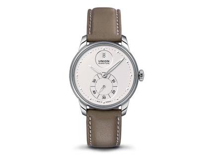 Automatik, Kaliber UNG-28.01, 60 Stunden Gangreserve, Edelstahl, Durchmesser 36 mm, Höhe 9,9 mm, weißes Zifferblatt mit Indizes, beiges Lederband mit Faltschließe, Saphirglas, 5 bar wasserdicht