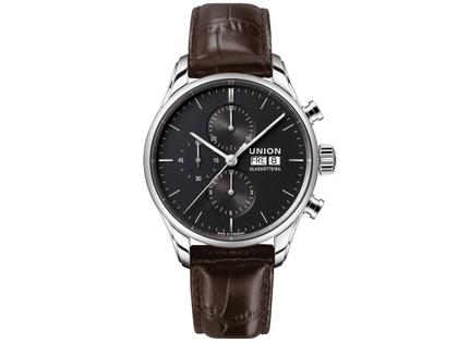 Herrenchronograph, Automatik UNG-14.01, 60 Stunden Gangreserve, Edelstahlgehäuse mit einem Durchmesser von 44 mm, Höhe 14 mm, schwarzes Ziffernblatt mit Day Date-Anzeige, Stoppfunktion, Indizes, dunkelbraunes Lederband mit Faltschließe, Saphirglas, Glasboden, 10 bar wasserdicht
