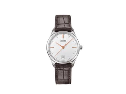 Union Glashütte Viro Datum Automatik Edelstahl 34mm silberfarbenes Zifferblatt braunes Lederband