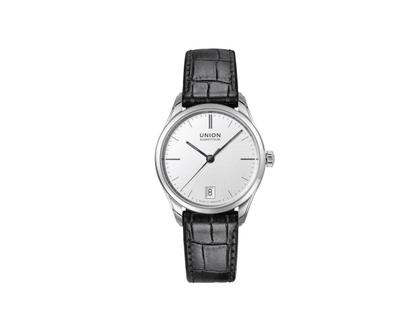 Union Glashütte Viro Datum Automatik Edelstahl 34mm silberfarbenes Zifferblatt schwarzes Lederband