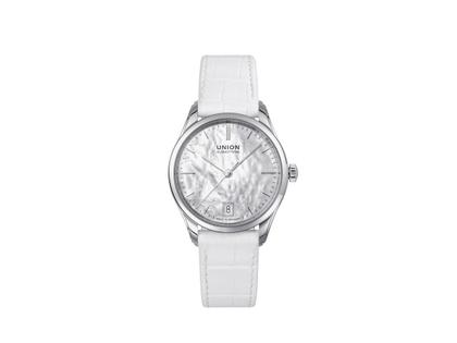 Union Glashütte Viro Datum Automatik Edelstahl 34mm weißes Perlmutt-Zifferblatt weißes Lederband
